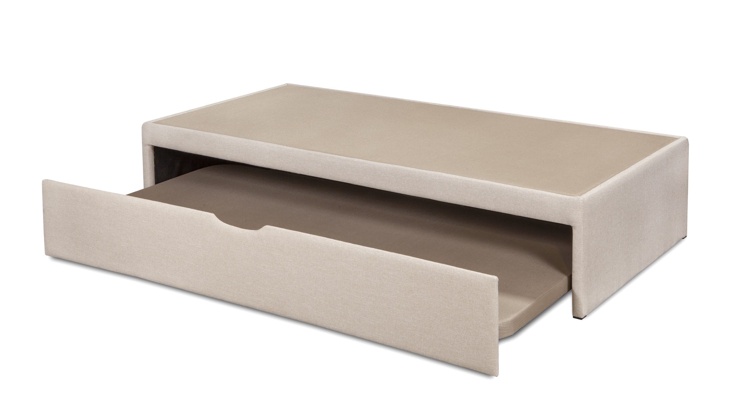La cama, base tapizada inferior, cuenta con patas plegables y ruedas para facilitar el uso.
